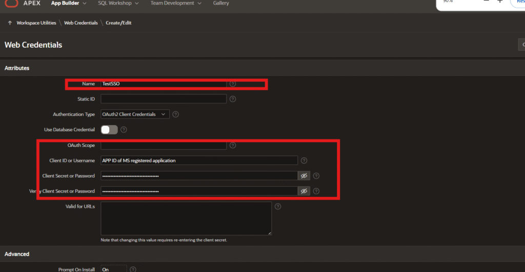 • Redirect URI: Choose “Web” and enter: https://<your-apex-domain>/ords/apex_authentication.callback
