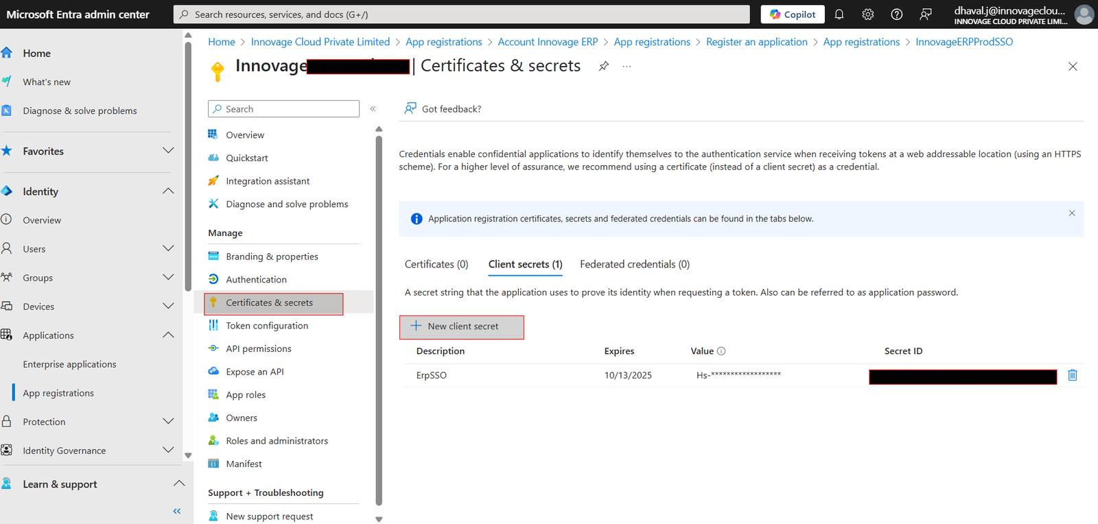 • Important: Copy and securely store the client secret value — it won’t be visible again.